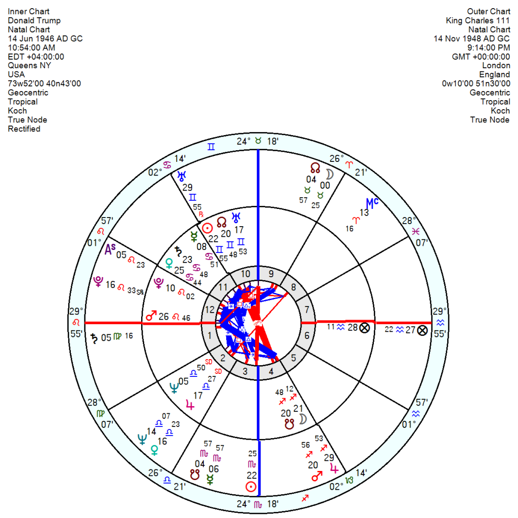 Charles’s Scorpio Sun is conjunct DT’s IC at the start of his 4th house so he is important in connecting to DT’s roots through his Scottish mother. Charles’ Saturn falls in DT’s 1st house so he will damp down some of his exuberance. At best he might add a hint of gravitas.