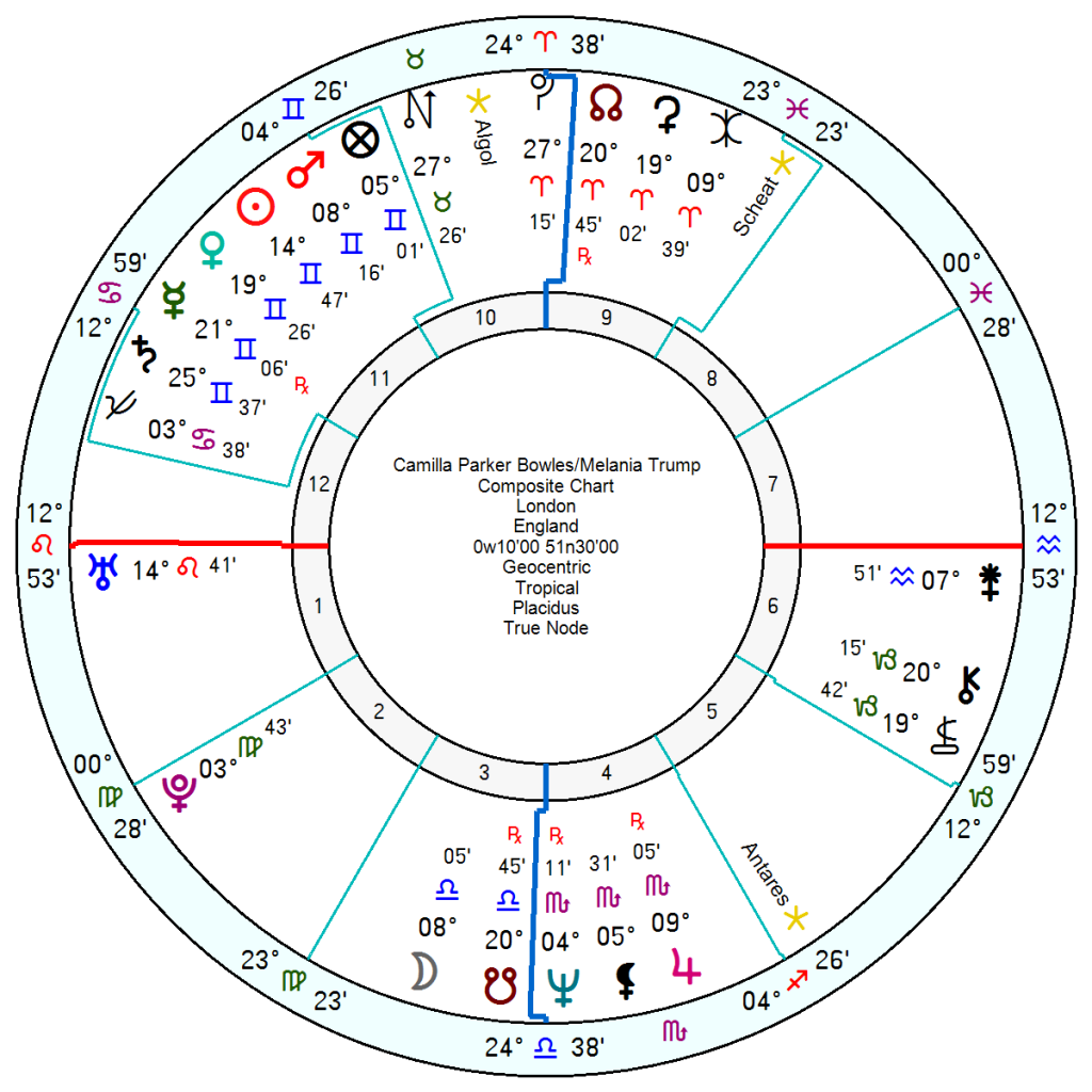 Camilla and Melania are a different matter. They are both tough-minded ladies – Melania with a Sun Saturn in Taurus and Camilla with a Saturn Pluto conjunction in Leo. Both have Mars in direct-speaking Gemini and Jupiter in money-magnet Scorpio. Their relationship chart has a hostile/toxic dislike composite Mars square Pluto with an argumentative Sun Mars. It will no doubt be all covered over by saccharine smiles.