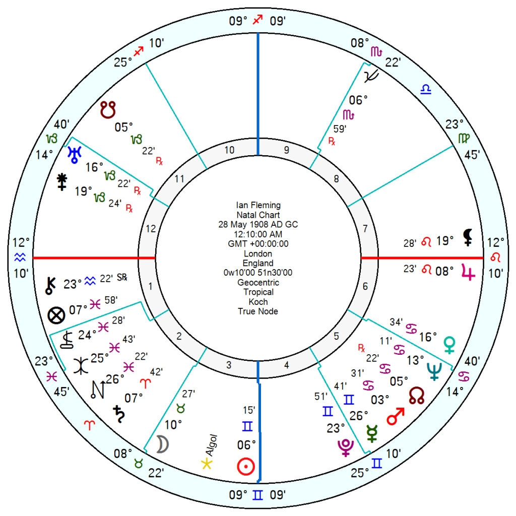 Ian Fleming, 28 May 1908 12.10 am London, the James Bond creator, another Air Sun in his case in Gemini, also had a harsh Mars conjunct North Node square Saturn; and Uranus opposition Neptune.