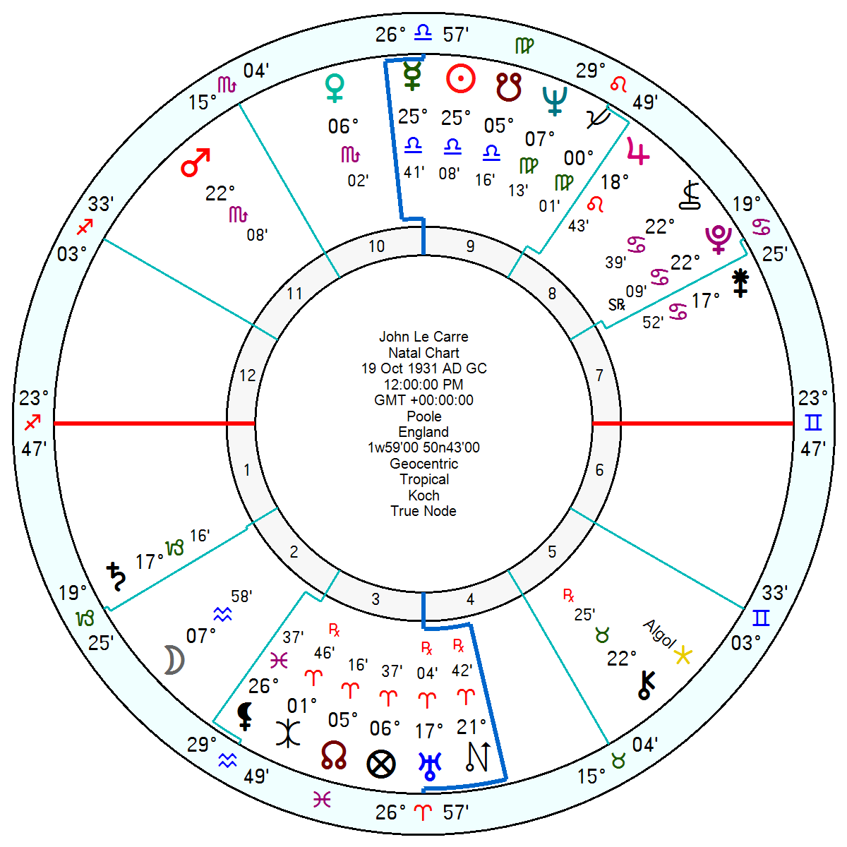 And John Le Carre, 19 October 1931, London, of Tinker, Tailor, Soldier, Spy renown was a Libra Sun Mercury with a fearsome Mars in Scorpio opposition Chiron Algol and trine Pluto. He was of the Depression generation with the bleak Saturn opposition Pluto square his Libra Sun Mercury and opposition Uranus in a Cardinal Grand Cross giving him extraordinary resilience and initiative.