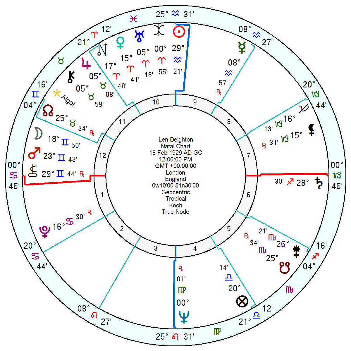 He had a final degree Aquarius Sun opposition Neptune which was trine/sextile a Mars in Gemini opposition Saturn in Sagittarius. His Mercury in Aquarius square Jupiter Chiron in Taurus may account for his prolific output and wide range. His Taurus North Node was conjunct the destructive Fixed star Algol – and that plus his Mars Saturn would be what plugged him into the excitement, violence and fear of spycraft.