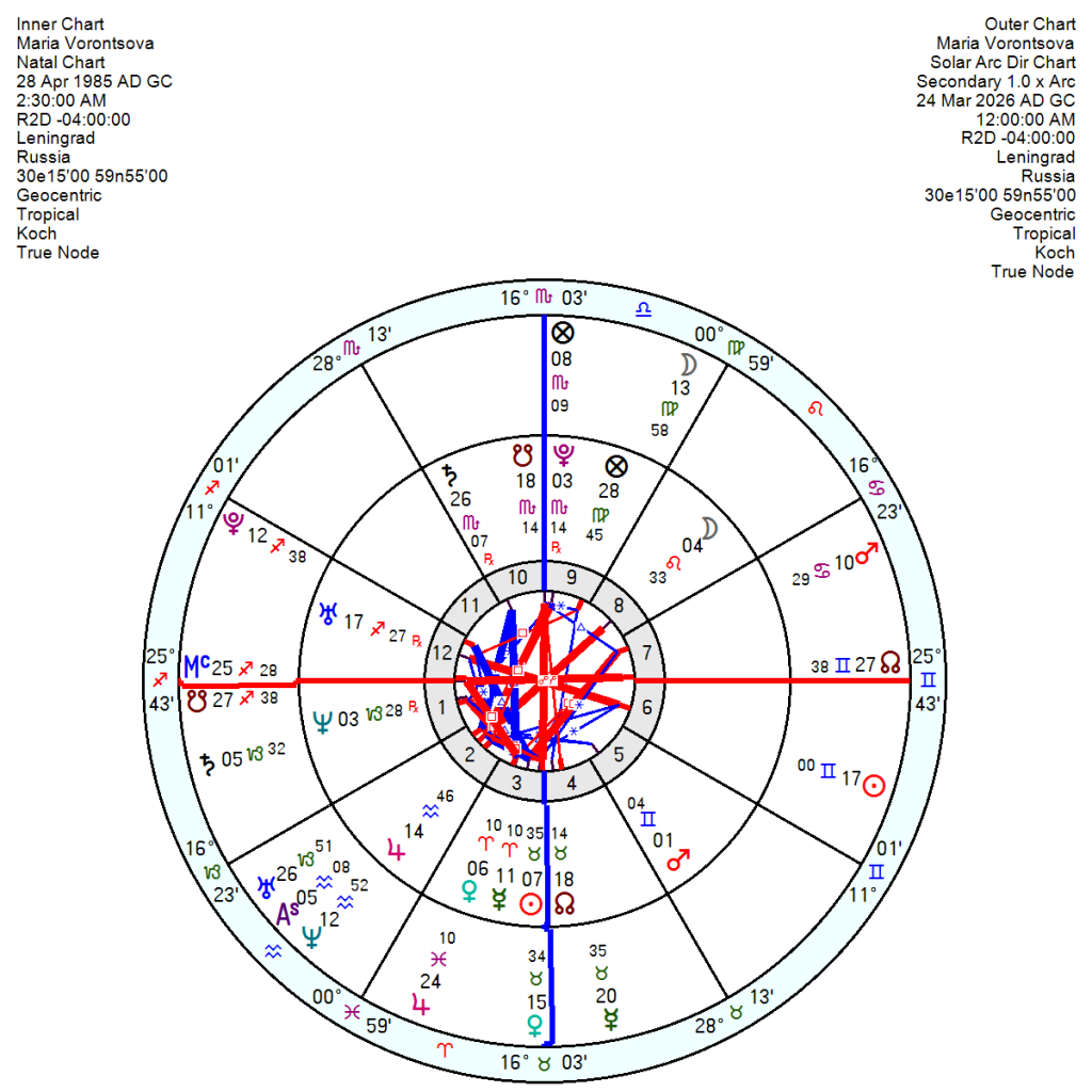 For whatever reason her life is undergoing considerable change exactly now and over the next two/three years. At the moment her Solar Arc Sun is opposing her 12th house Uranus, on the same degree now and exact within weeks. Tr Uranus will give her an additional jolt when it is conjunct her Mars in the second half of this May and again in early 2027. And tr Pluto is wending  inexorably round her Fixed T square from early this year, square her Pluto, opposition her Moon and in 2027/28 square her Sun. It will bring significant changes to her life under maximum pressure.