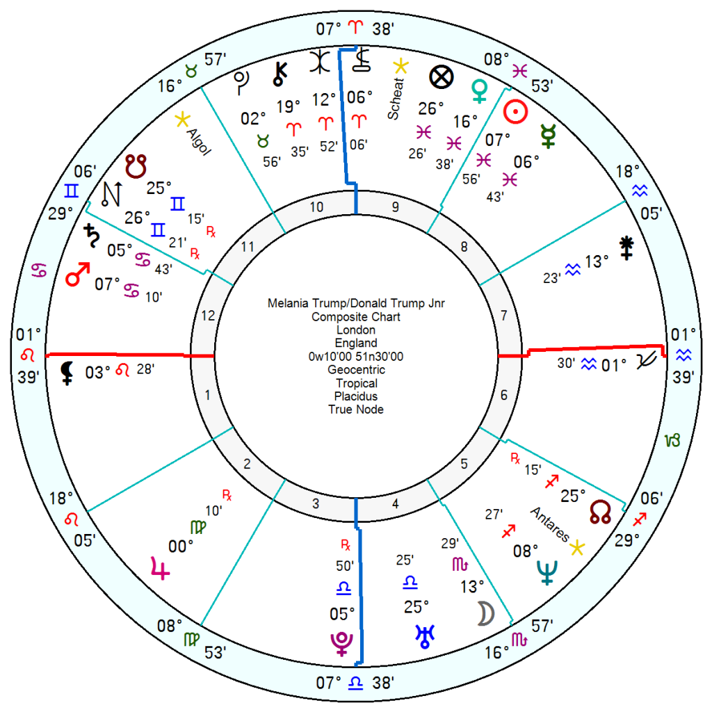 Her relationship with Ivanka was chilly in Trump’s first term but may be better now with less competition for attention. Melania’s relationship with Donald Trump Jnr is horrendous with a composite Mars Saturn conjunction square Pluto, hinting at toxic dislike – and it will hit the skids in a major way in 2027/28 with tr Neptune has aspects to that square.