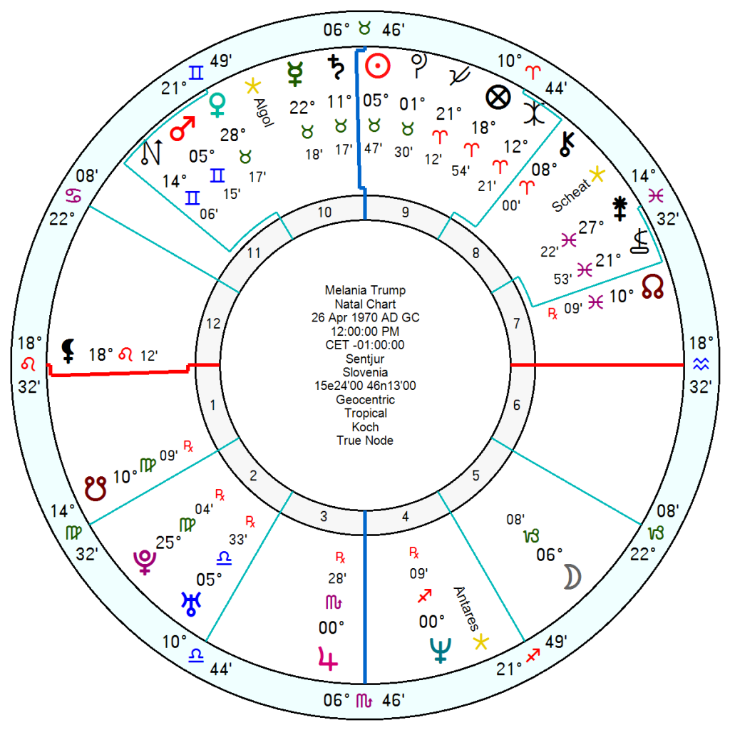 Melania was born with a Sun-Saturn conjunction in Taurus (April 26, 1970 in Novo Mesto, Slovenia), a combination that finds fulfillment through financial security and a stable home life. Her Sun-Saturn is strongly supported by a trine to her Moon in ambitious Capricorn, but she also has a spicy independent streak with her Sun’s tight quincunx to Uranus in Libra.