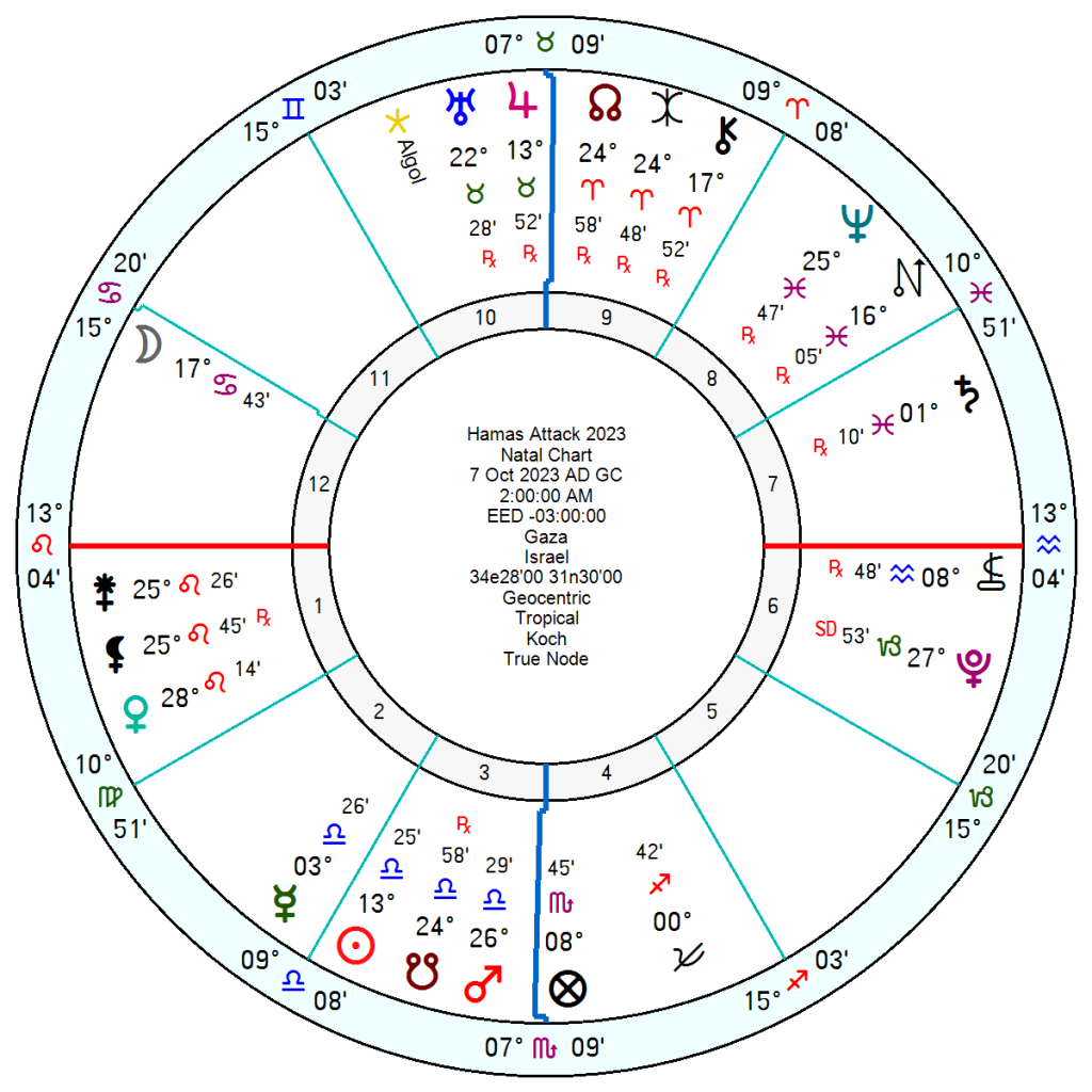 The Hamas Attack of 7 October 2023 on Israel, also had Eris conjunct Chiron and the North Node – a brutal act emerging from a sense of vengeance for past hurts but also one which would have wider repercussions through the North Node into the zeitgeist, and arguably the instigator for what followed including this Israel-US attack on Iran.