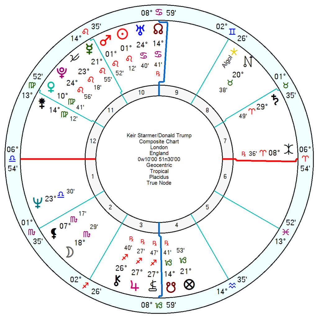Keir Starmer has made himself unpopular as his active dislike of Trump and his errant ways comes out into the open. Their relationship chart has an argumentative composite Sun Mars; with a chained-together and resenting-it Saturn trine Pluto with Pluto in a power-struggling trine to Jupiter; all capped off by a distrustful Saturn opposition Neptune in a highly-strung square to differing-agendas Uranus. Not happy campers for sure.