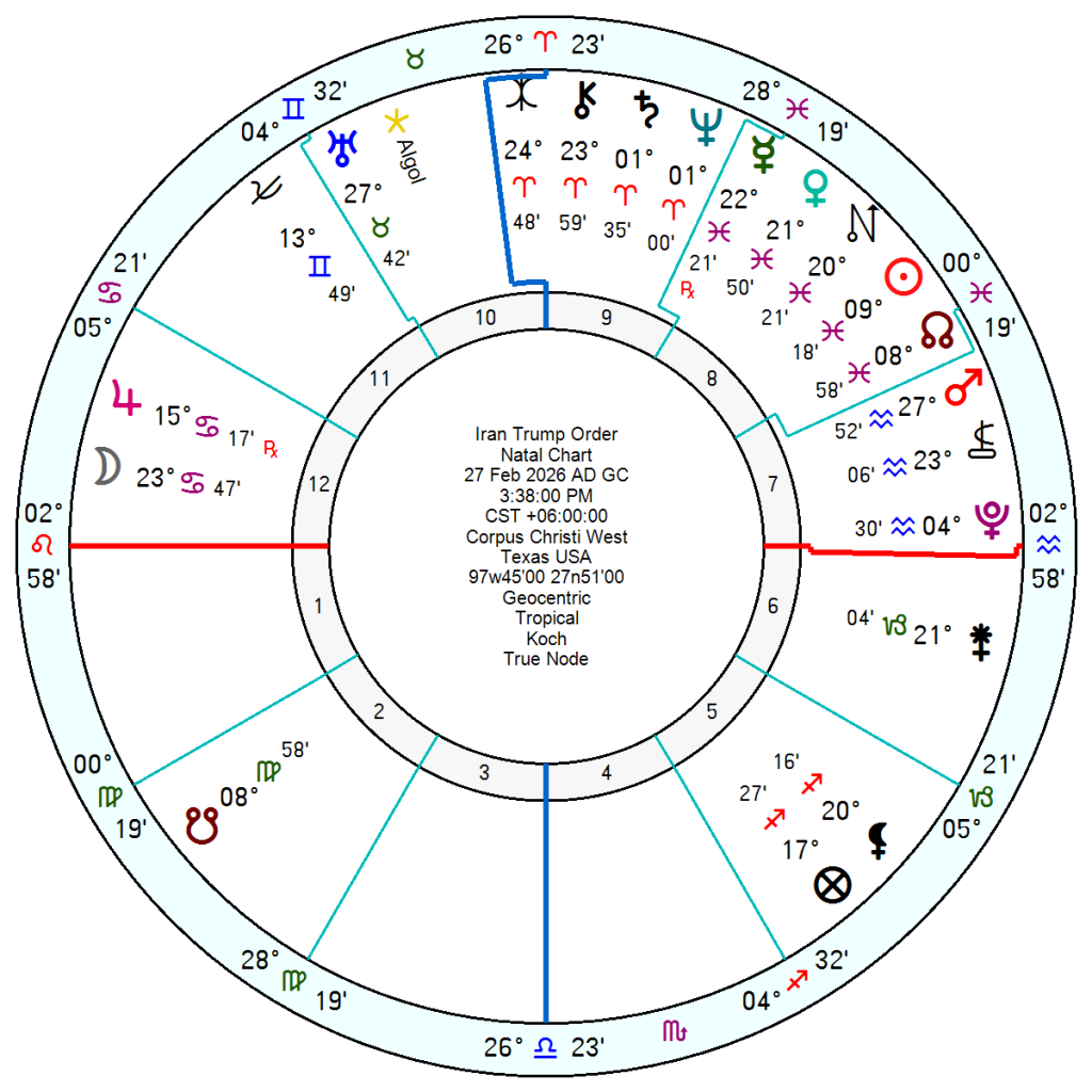 A somewhat obscure thought. Eris and Chiron were conjunct when the Iran Attack took place and indeed were close to the Midheaven when Trump gave the order on board Air Force One on the way to Texas on the 27th February at 3.38pm. Eris is the planet of discord, but a catalyst as well as an indicator of conflict, so has a positive purpose of bringing an overdue reckoning. Chiron is the wounded healer. So from that angle it could be seen as an act of chaos on Trump’s part spurred on by the hurt of domestic failures and looming Epstein taints.