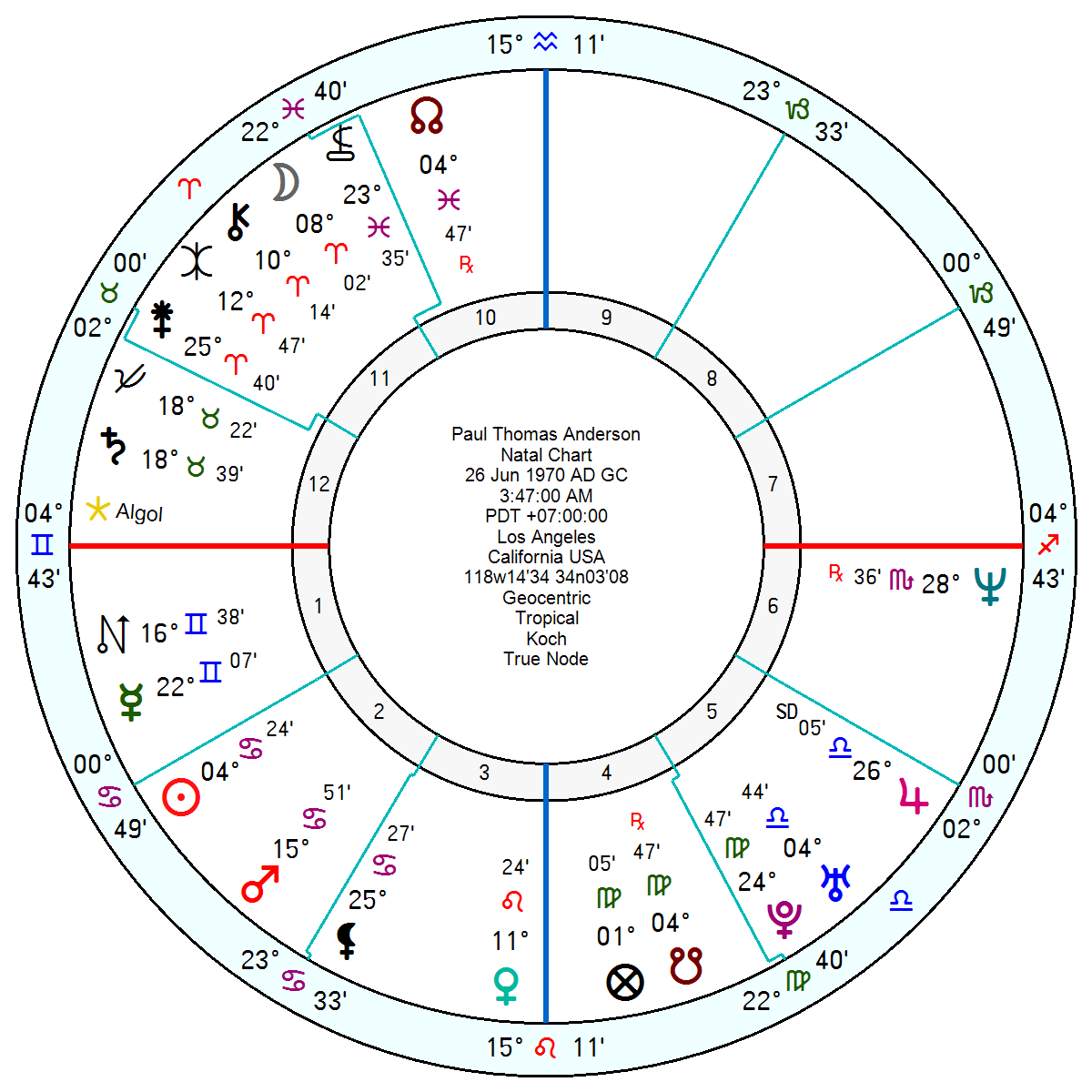 Paul Thomas Anderson 26 June 1970 3.47 am Los Angeles, has a Sun and Mars in Cancer, with is Sun in a rebellious square to Uranus. Tr Jupiter is conjunct his Mars for a morale boost exactly now and is also conjunct his Mercury/MC midpoint, square his Jupiter/Uranus and opposition his Neptune/Node midpoints; with tr Jupiter soon to square his Mercury/MC midpoint so he’ll glow for a while ahead.