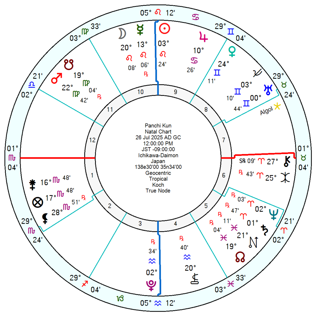 He was born 26 July 2025 in Ichikawa, Japan as the new era dawned with his Leo Sun forming a Half Grand Sextile in opposition to Pluto which is sextile/trine Uranus in Gemini and Saturn Neptune in Aries. Destined to have an impact. His Mercury and Moon are also in attention-seeking Leo and he has Jupiter in home-loving Cancer. He also has his Mars in Virgo opposition North Node and Nessus square Venus in social-butterfly Gemini – so perhaps a hint of keeping-the-faith Pisces North Node for better times to come.