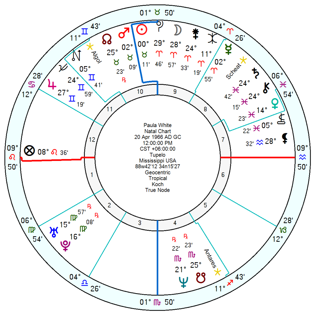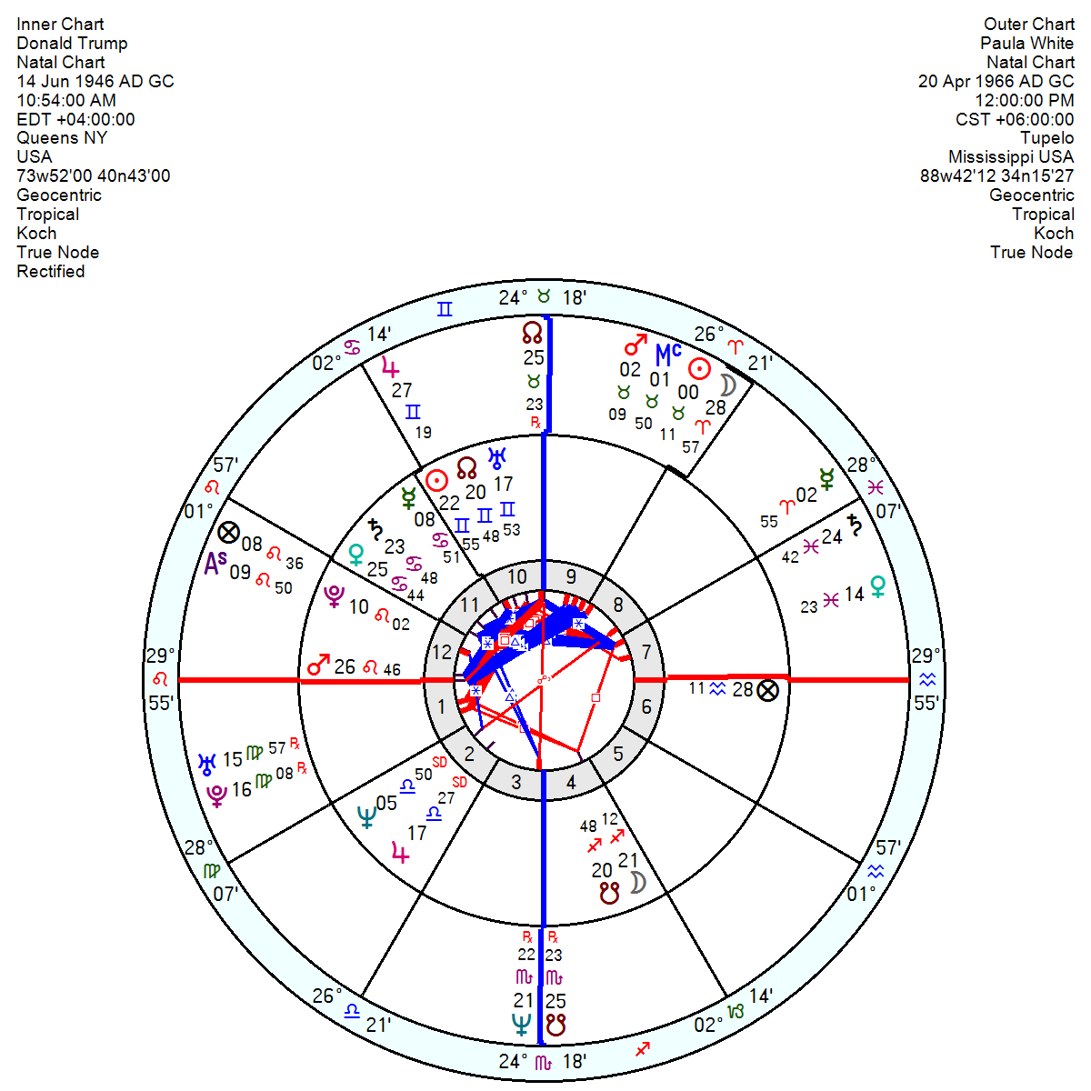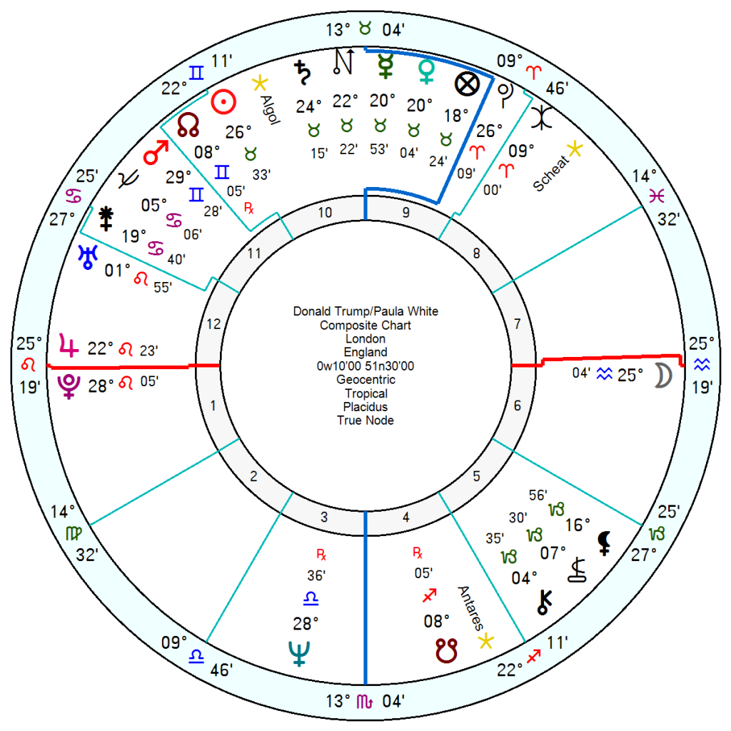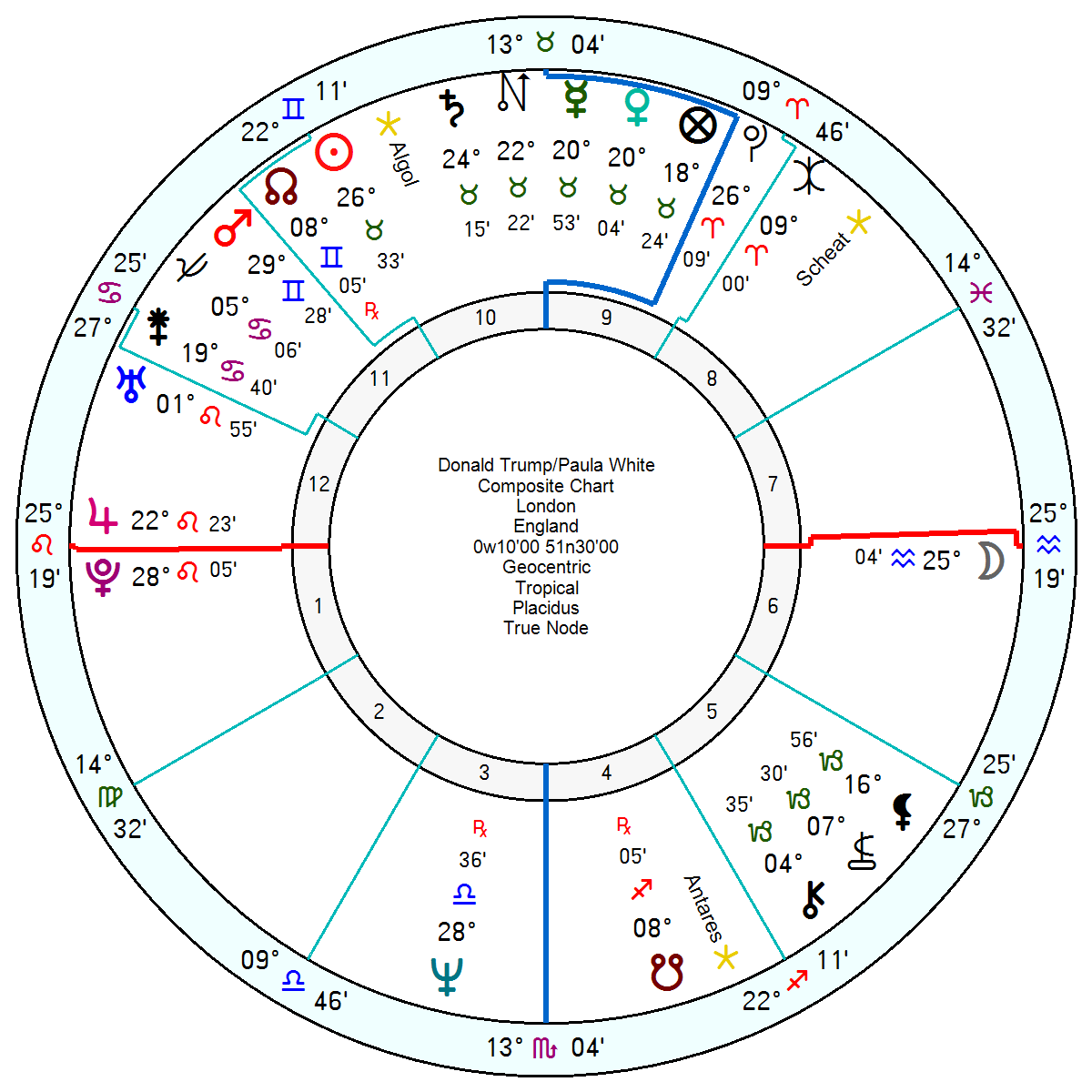 Her relationship with Trump is intertwined – with her North Node conjunct his Midheaven = her destiny tied into his career status; her Neptune conjunct his IC = the idealised father; and her Jupiter conjunct his Sun = she boosts his ego. Her assertive/aggressive Sun Mars falls in his ‘spiritual’ 9th.