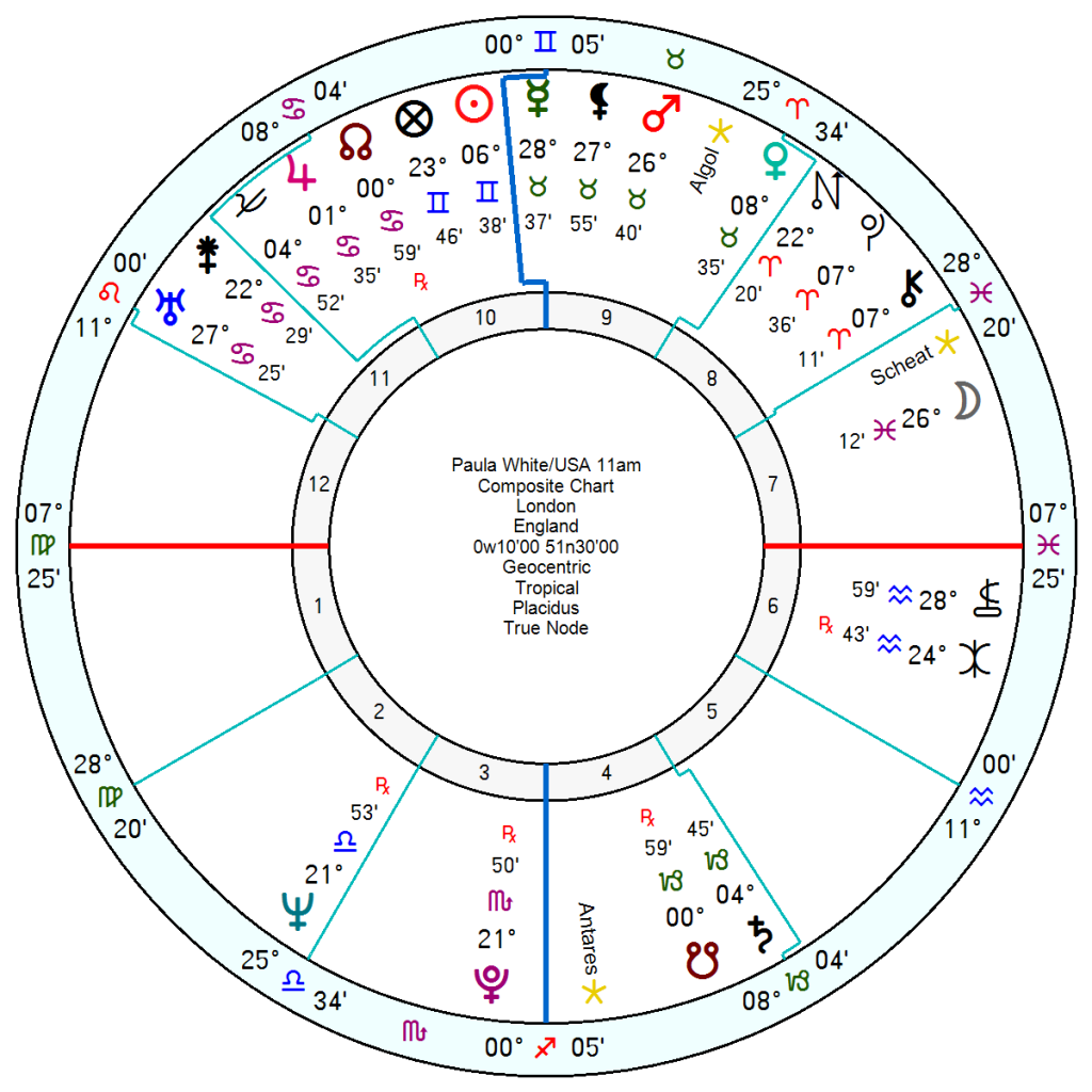 Her relationship with the USA chart is a different matter – with a hostile composite Mars opposition Pluto – and an unstable, probably divisive Jupiter opposition Saturn which is being undermined this year by tr Saturn Neptune in hard aspect; and more so in 2027 as tr Uranus is conjunct the Sun for a possible separation.