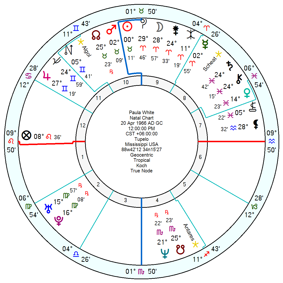 Her Taurus North Node suggests a turbulent life as she is pulled back into the Scorpio South Node’s obsession with money and sex. Her spiritual redemption requires a return to nature and peace.