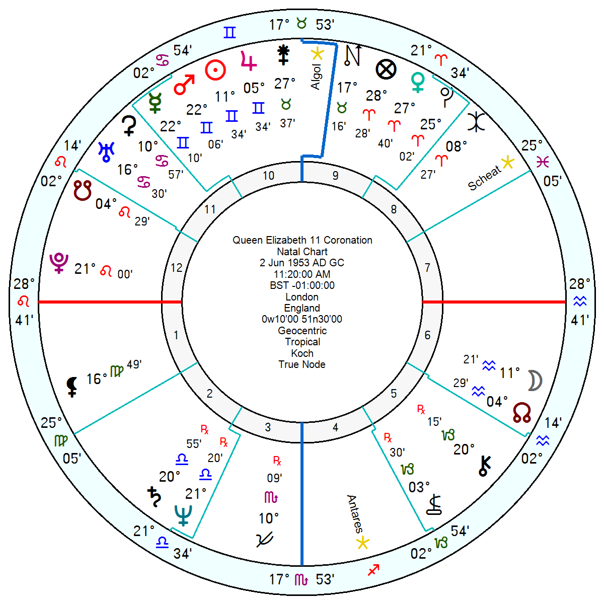 Her Accession, 6 February 1952 5pm, when she was holidaying in Kenya, came when there was a sombre Sun opposition Pluto; with the tr Pluto conjunct her Neptune for a devastating experience. There was also Jupiter in Aries opposition Saturn square Uranus opposition Venus for a sudden emotionally upsetting change. Her Coronation 2 June 1953 was a happier affair with a 10th house Sun Jupiter in Gemini trine an Aquarius Moon; with a well-starred Half Grand Sextile from Venus opposition Saturn Neptune sextile Mars Mercury and sextile Pluto. [Saturn being close to Neptune when Elizabeth 1 was crowned in 1559 as well.]