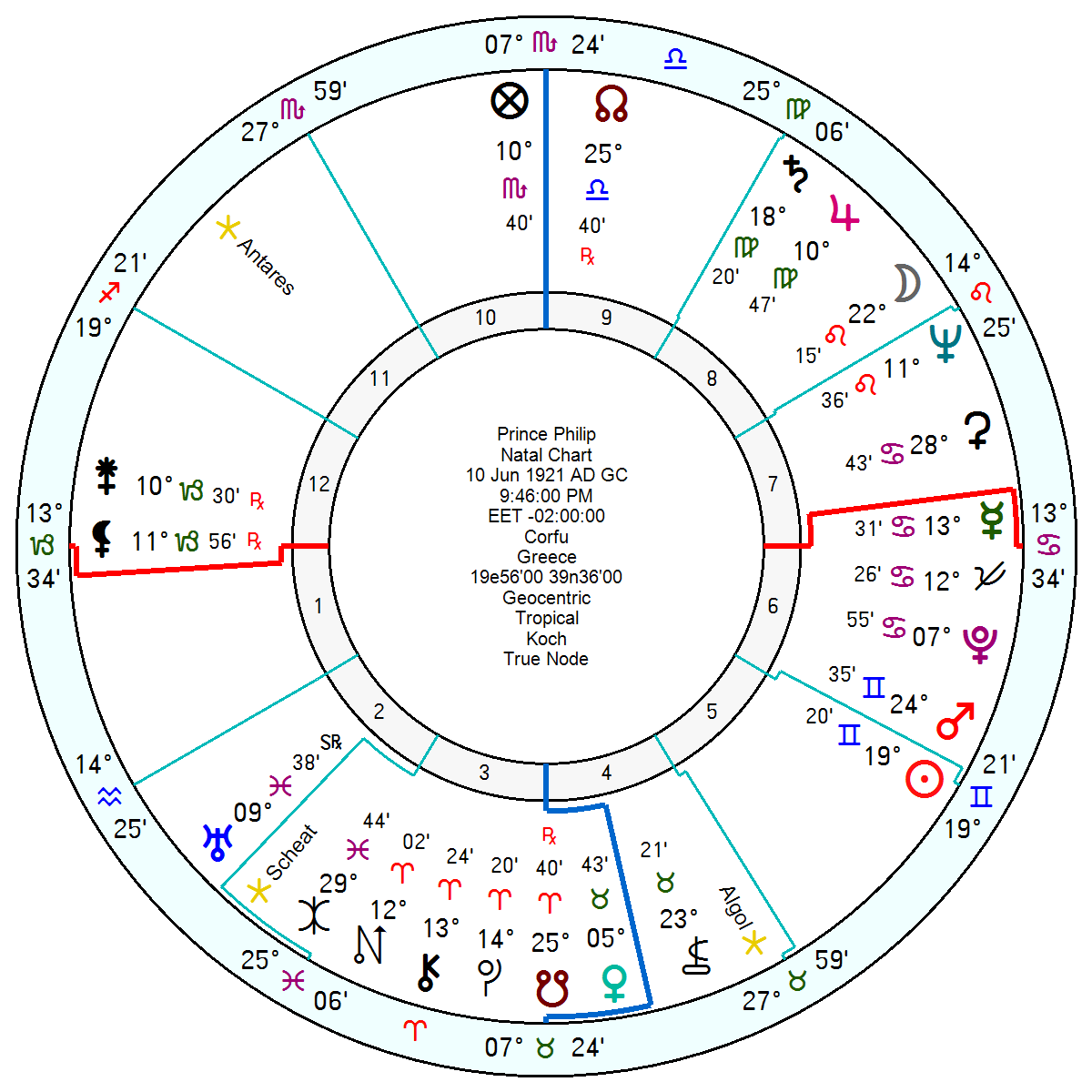 Prince Philip, 10 June 1921 9.46pm, Corfu, had a high-vitality Sun Mars in Gemini which fell in her 5th house not only of children but also social fun, so he would be a lively antidote to her rigorous duties. His Venus in Taurus was conjunct her Sun for deep affection and he shared her Moon and Neptune in Leo. He also had a Libra North Node so like her did not always find close relationships and the compromises involved easy.
