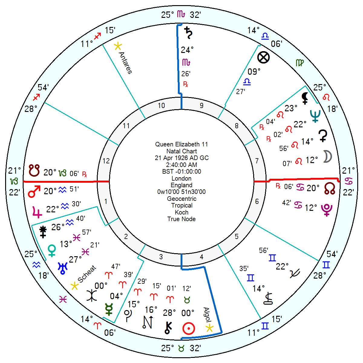 Born 21 April 1926 2.40 am London. She was not expected to succeed to the throne until her wayward uncle the Duke of Windsor abdicated when she was 10, leaving her insecure father no option but to become king. George V1 was a charming Sun Sagittarius with Venus in Scorpio on his Ascendant and Jupiter in Leo on his Midheaven. But a troubled Neptune Pluto in his 8th, a legacy from intergenerational tangles, which opposed his Sun and Mercury plus an agitated Scorpio Moon conjunct Mars gave him an unsettled temperament which made his stalwart service during WW11 all the more laudable.
