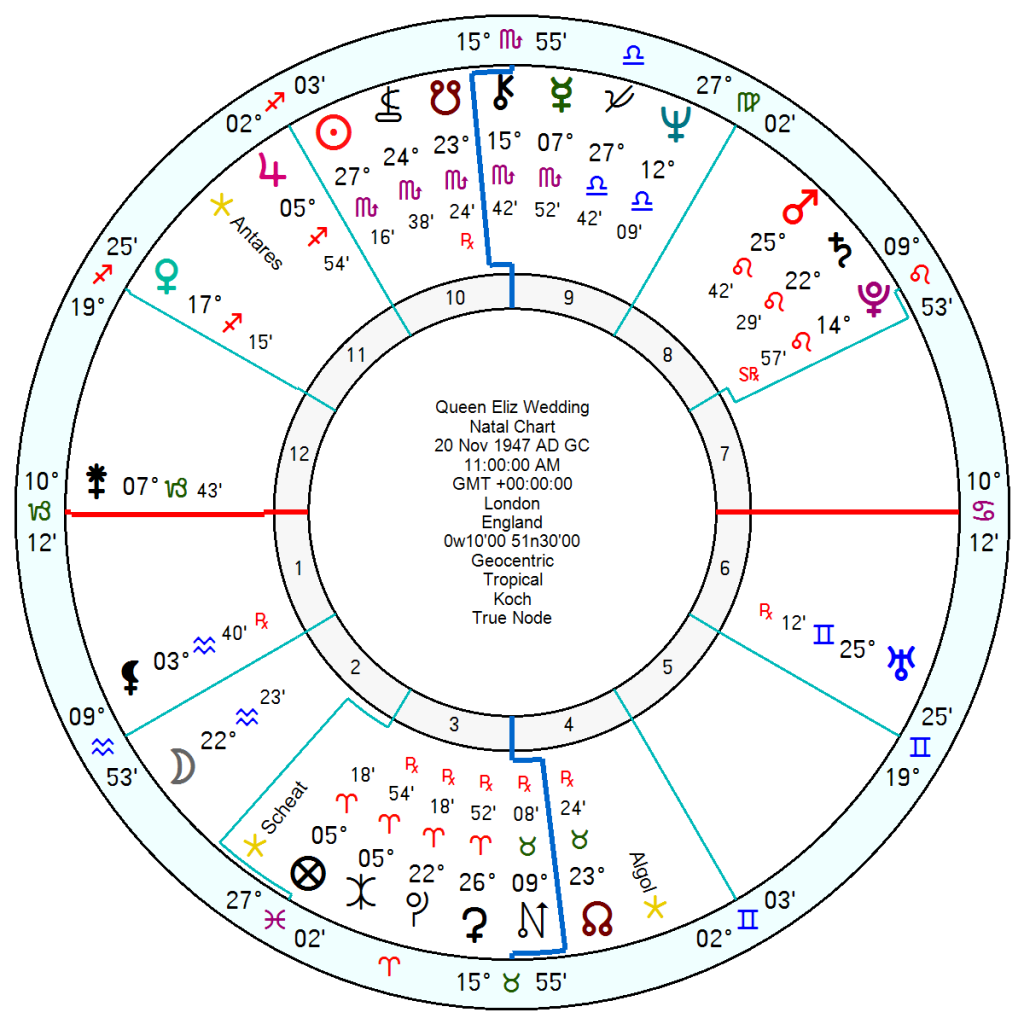 Her Sun/Moon midpoint was square her Uranus emphasising that point. But luckily Prince Phillip’s Gemini Sun (and Mars) were conjunct her Sun/Moon for a liaison, while not always easy, that stood the test of time. Their wedding chart from 20 November 1947 was truly difficult with a Mars Saturn conjunction and Saturn conjunct Pluto in the 8th opposition Moon square North Node opposition Sun – so not exactly a rousing send off.