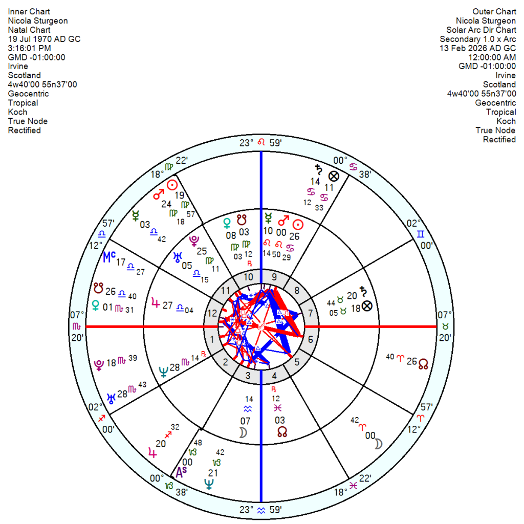 Nicola Sturgeon, 19 July 1970 3.16pm Irvine, Scotland, now separated from her husband, stepping down as an MSP and not facing any charges, is nerve-stretched at the moment with her Solar Arc Uranus conjunct her Neptune and tr Uranus about to oppose her Neptune in March. She looks trapped and frustrated in 2027 with her Solar Arc Mars conjunct her Pluto; and discouraged by 2028. Not an easy few years ahead as she steps down from a period of glittering acclaim.