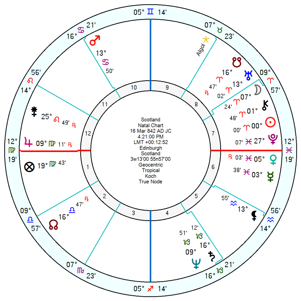 Both the Scotland 16 March 842 and 25 March 1005 have an Aries Sun with other Aries planets so will not find tr Neptune Saturn does much for their fighting spirit. Time to regroup and rethink.
