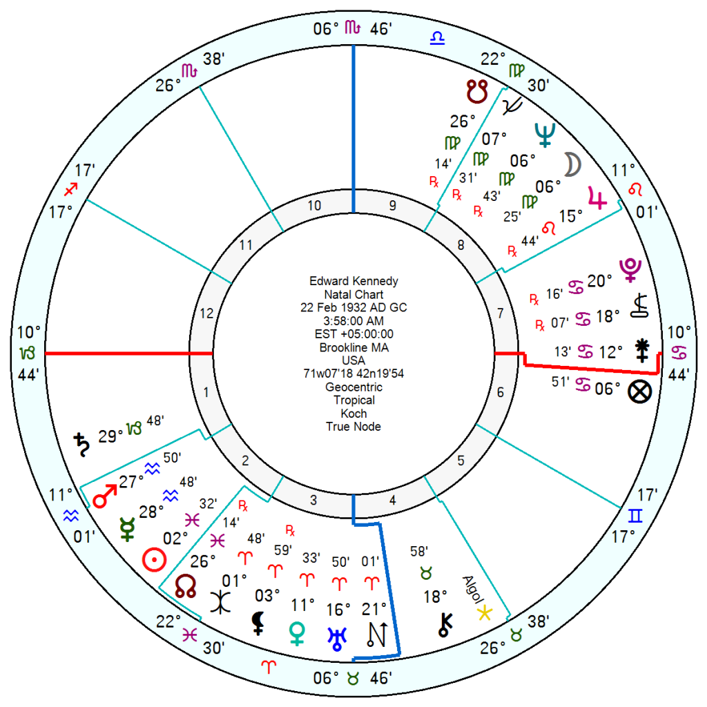 One other is Edward Kennedy, 22 February 1932 3.58 am Brookline, Massachusetts. At the time of his death there was a division of opinion given his callous behaviour over the death of Mary Jo Kopechne and his reputation as a serial womaniser and philanderer. But there were those who pointed to his superior political abilities in resolving cross party disputes, being able to cross the aisle and negotiate settlements with ‘the other side.’