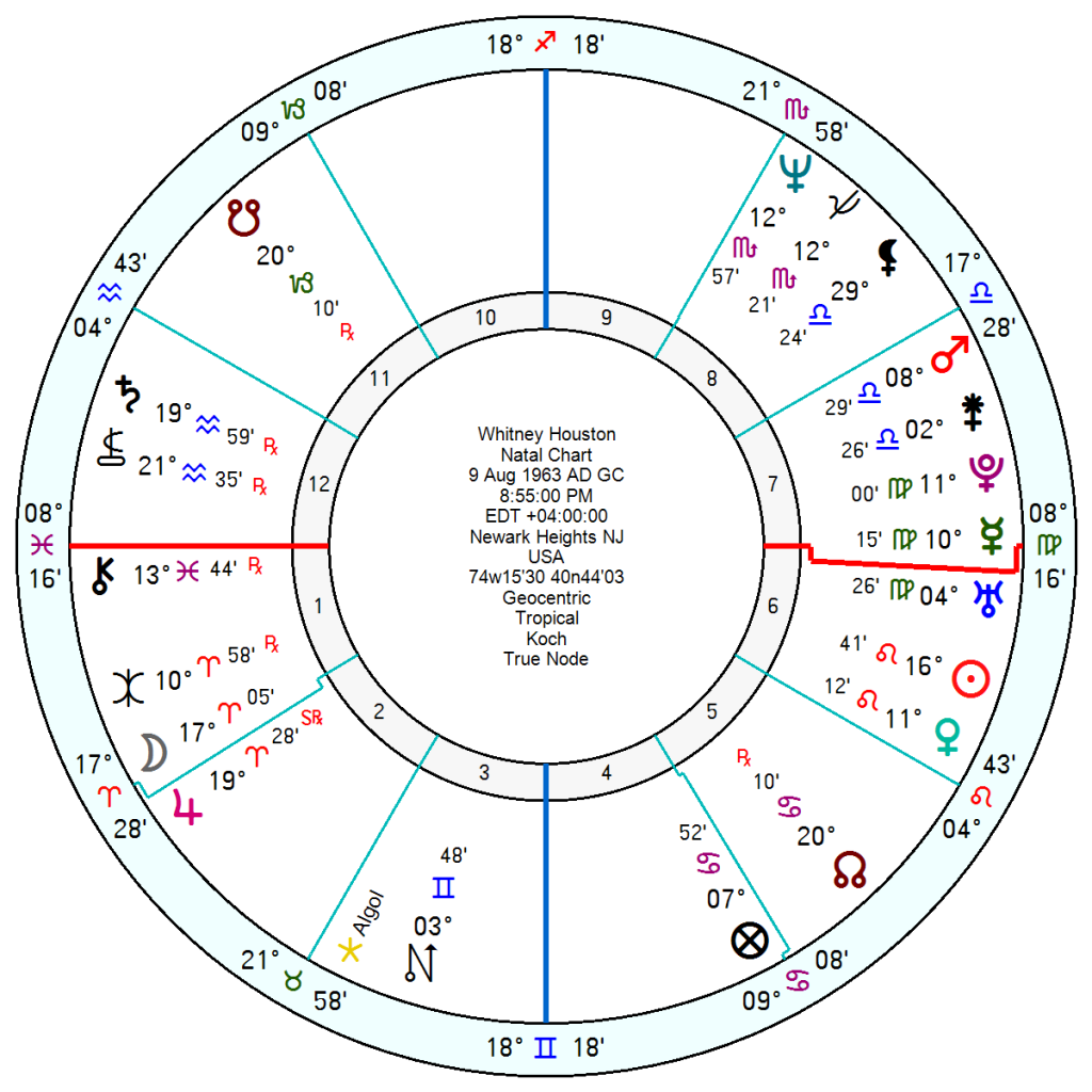 Whitney Houston, 9 August 1963 8.55pm Newark Heights, NJ, was another, though in her case partnerships proved her downfall. A 6th house Leo Sun Venus opposed a 12th house Saturn; and her Moon opposed Mars.