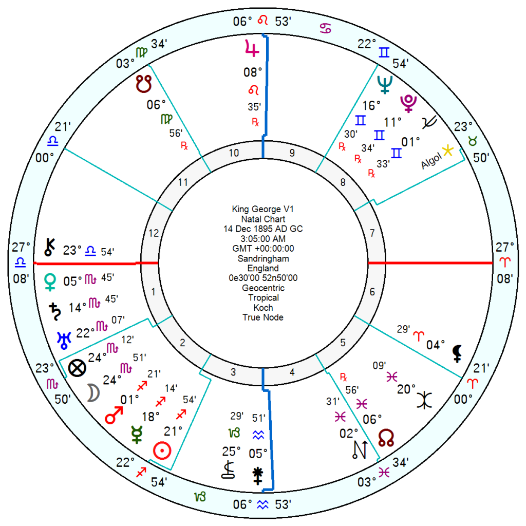 King George V1, 14 December 1895 3.05am Sandringham, England, was also see saw with an 8th house Pluto Neptune opposition his Sun Mercury. Despite a flawed character and uncontainable temper, he managed against his inclinations to take over the throne and pull the UK together through the war years with the help of his redoubtable wife.