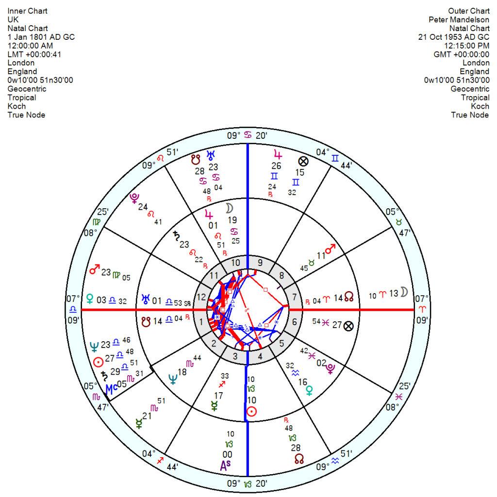 What is incontrovertible is that Mandelson’s Pluto is conjunct the UK’s 11th house Saturn in Leo which represents the legislature. So his cold, dark hand was undoubtedly clamped round the political merry-go-round in ways that were clearly unhealthy. His Uranus also falls in the UK 10th giving him the ability to shift the UK’s direction.