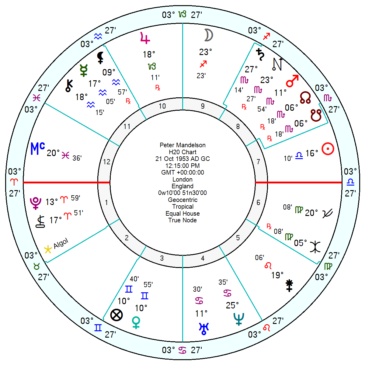 One further Mandelson thought. His most notable Harmonic is the 20H with a Grand Cross of Sun, Pluto, Uranus, Jupiter. The 10H is the wheel of fortune – fate throws high and then low. 20H is twice that. In the Tarot, the number 20 is the number of the Judgement card which says “What you reap, you sow.” The German mystic, Jacob Boehme associated the number 20 with the Devil or in Jung’s terms the shadow self.