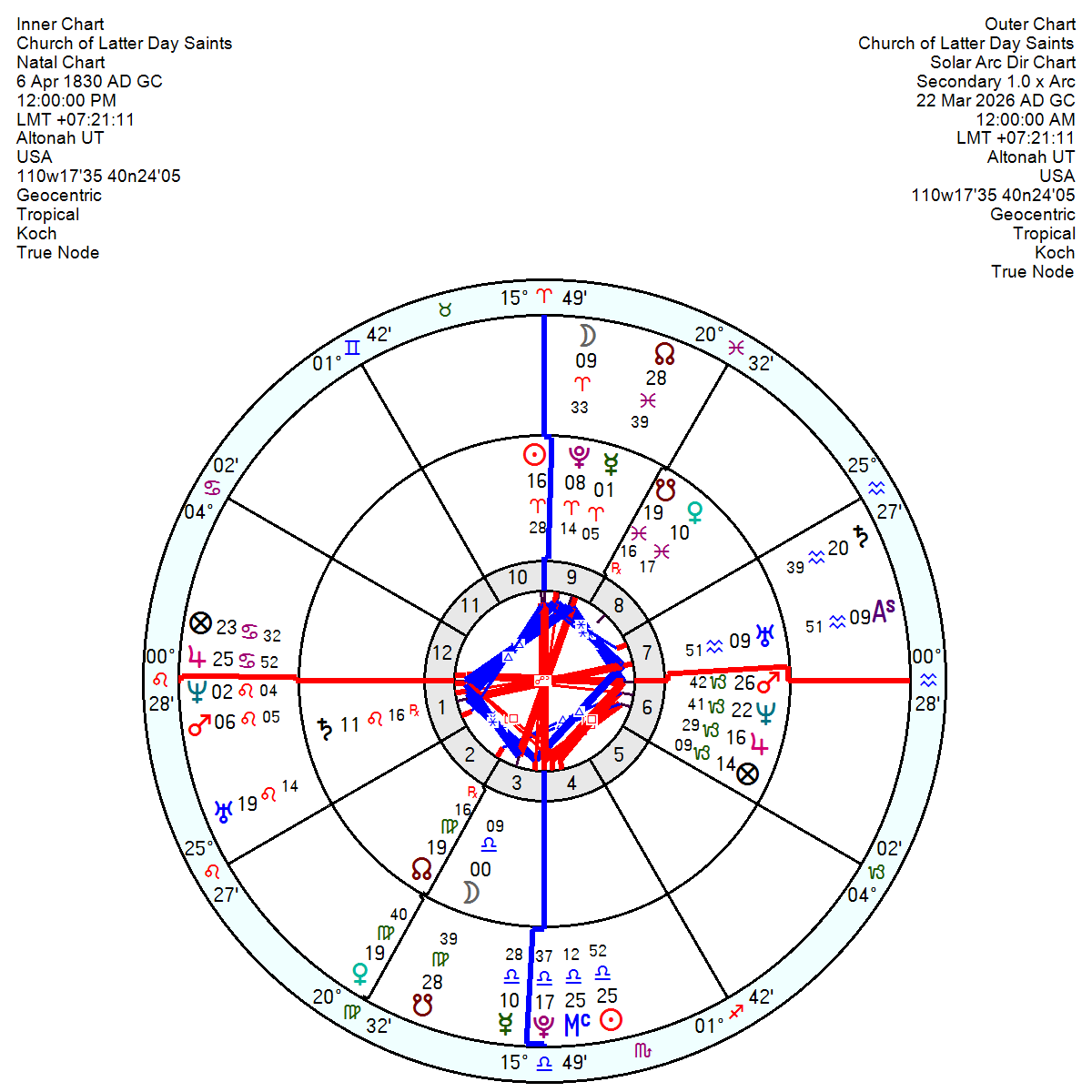 The Church of Latter Day Saints (Mormon), 6 April 1830 in Utah, hooks into her Uranus Neptune conjunction in Capricorn with its Neptune Mars in Capricorn. Its chart has been troubled recently with Solar Arc Pluto opposition its Aries Sun and its Solar Arc Sun square Neptune – so the ‘swinging’ publicity would not have gone down well. There’ll be another shock coming soon with SA Sun square Mars – and a major history-changing phase across the end of the decade into the early 2030s with tr Pluto conjunct its Uranus and opposition its Saturn; followed by SA Pluto square the Neptune and by mid 2030s the Mars for a dead halt.