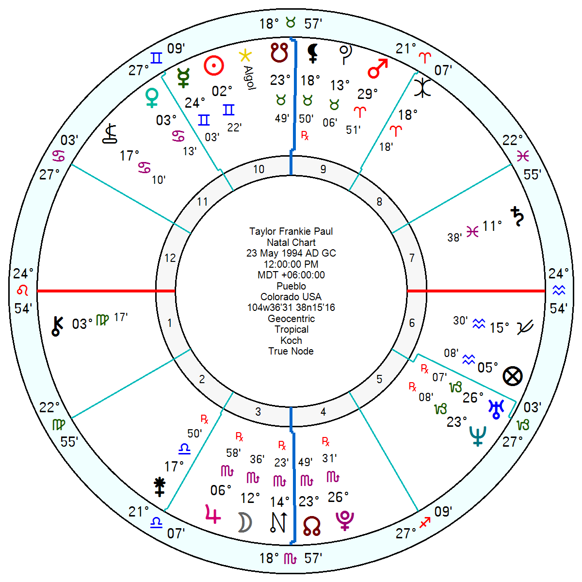 Born 23 May 1994 in Pueblo, Colorado, she has a Sun Gemini and a Scorpio Moon which is a fairly conflicted combination – alternatively detached and chatty and intensely emotional. But more significantly she has a highly-string Uranus Neptune conjunction in a short-fused square to Mars in upfront Aries. Her Neptune Uranus sextile Pluto are also inconjunct her Sun on the apex of a yod, giving her problems moderating her ego drives. She has another yod of Venus in Cancer sextile Mars inconjunct Pluto which again will give her problems moderating her need to be in control. It can be manipulative and coercive. She also has a wide Water Grand Trine of Saturn in Pisces trine Jupiter (Moon) in Scorpio trine Venus, which can lead to a personality which is cut off in some respects from reality.