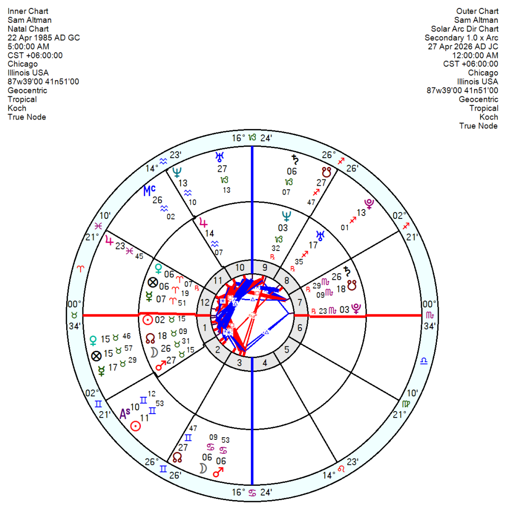Altman, 22 April 1985 5am Chicago, Illinois, is an ultra-determined Sun Taurus (trine Neptune) opposition Pluto; with an even more rigorous, hard-ass Mars Moon in Taurus opposition Saturn in Scorpio. Birth time being accurate, he has his Solar Arc Midheaven squaring his Mars opposition Saturn now and in 2027 which hints at a considerable setback.