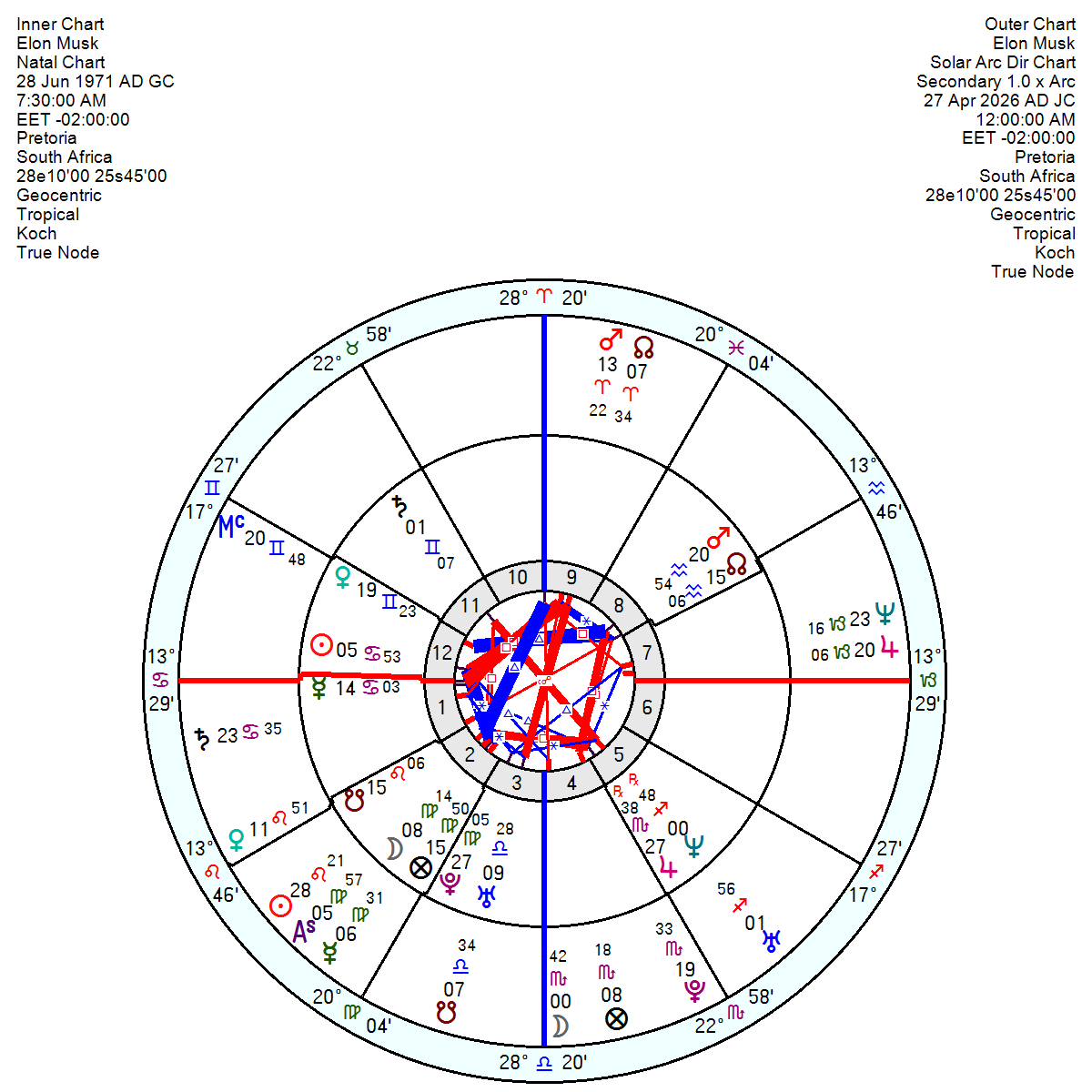 Musk, 28 June 1971 7.30 am Pretoria, South Africa, however does not look like racing off to wave the victor’s wreath, Tr Uranus will rattle his Neptune opposition Saturn from now into 2027 for jolts, jangles and panics; in 2027 as well tr Neptune moves to an undermining square to his Cancer Sun; with a grind-to-a-halt and spit-teeth frustration in late 2027/28 as his Solar Arc Pluto squares his Mars.
