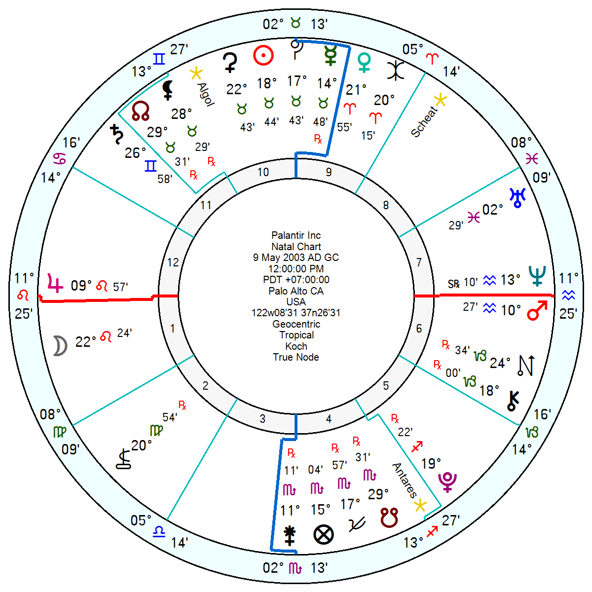 Along the same timeline, Palantir, 6 May 2003, looks jammed up in 2028 with tr Pluto square its Mars, moving through an opposition to its Jupiter and then a conjunction with its Neptune in 2031/32 – that looks like an over confident push which may not end well.