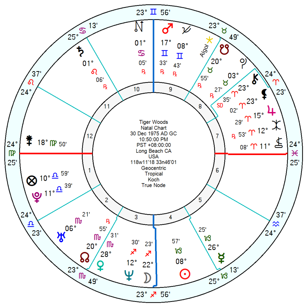 And Tiger has Solar Arc Saturn (at his Virgo ASC) squaring his Sagittarius Moon at IC, suggesting a significant individual turning point or crisis. Perhaps created by a lunar tolerance for risk and excess, mixed with a lack of personal responsibility and firm boundaries (Saturn).