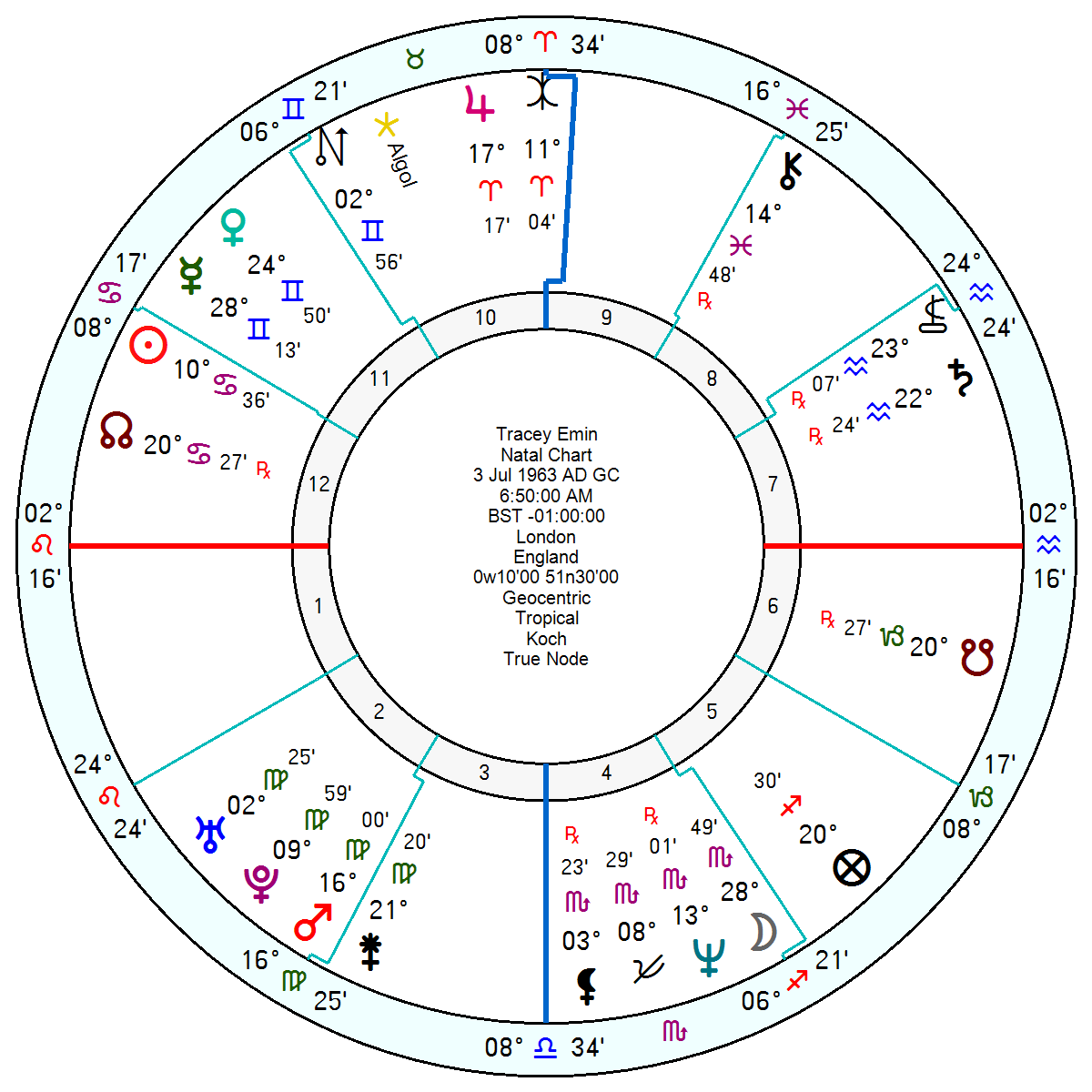 She has a 12th house creative Sun Cancer trine a 4th house Neptune in Scorpio sextile (Uranus) Pluto Mars in Virgo – she dreamt of a happy home and ended up with ruthless, unkind Mars Pluto, which last would admittedly give her a do-or-die determination. But what is certainly her saving grace is an upfront and resolutely optimistic Jupiter in Aries in her 10th on the focal point of a yod inconjunct Mars sextile Neptune. An apex Jupiter would give her the confidence to promote herself, sometimes a touch too vigorously, but as a counter balance to her problems it would be a definite advantage. Her Saturn in the cusp of her 8th is square an intense Scorpio Moon and trine her Venus Mercury in Gemini – so emotional rejection would cut deep. Her Saturn is conjunct the centaur asteroid Chariklo, which carries the tale of eternal suffering. Algol, the destructive Fixed star, is in her 10th.