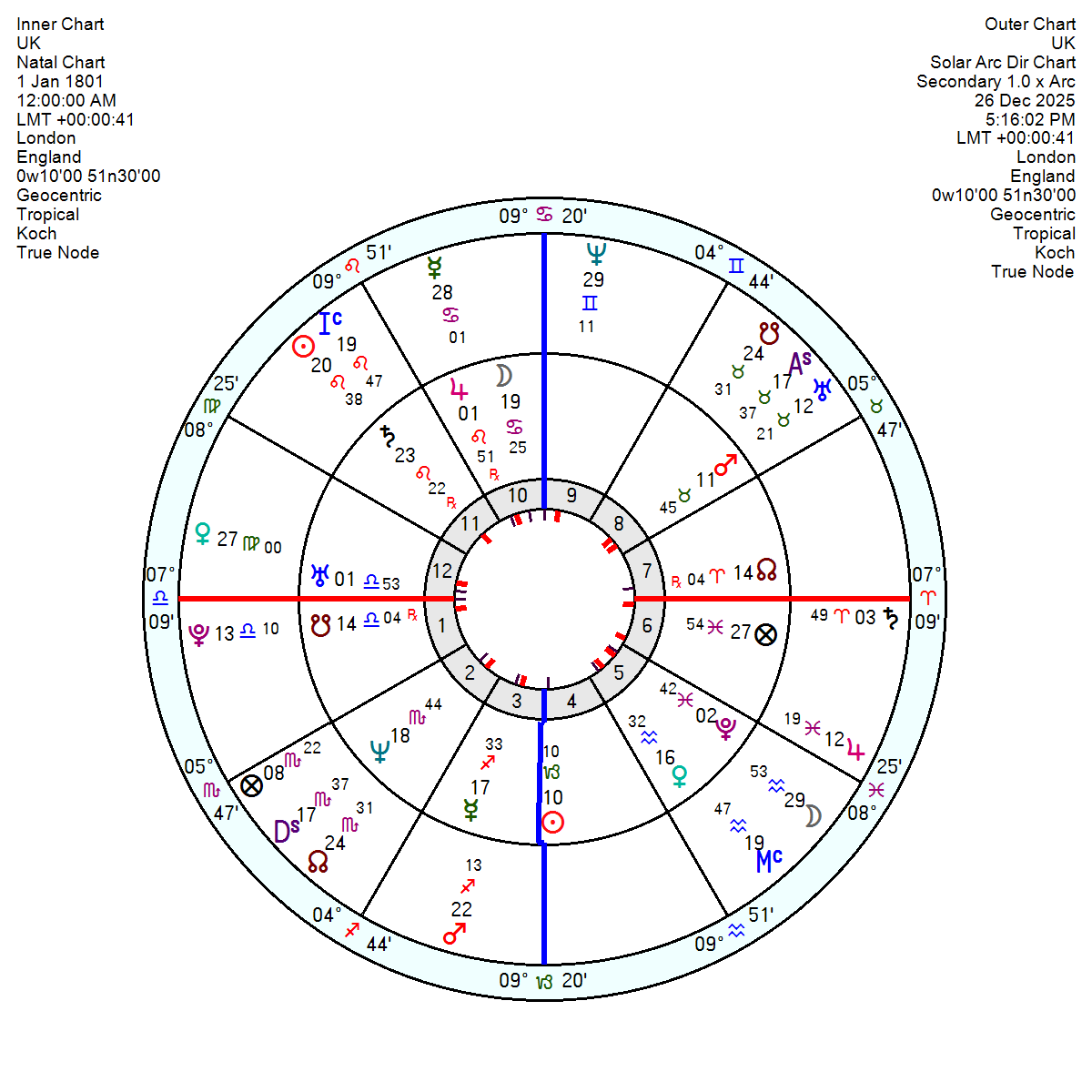 The Solar Arc Pluto moving through the UK 1st will also be conjunct the UK South Node in 2026 which could have a negative effect. The hint is that its time to let go an overly independent stance (SN in 1st) and make an effort to be more cooperative, made more difficult by the NN sitting in the 7th house of relationships thus requiring a considerable effort.