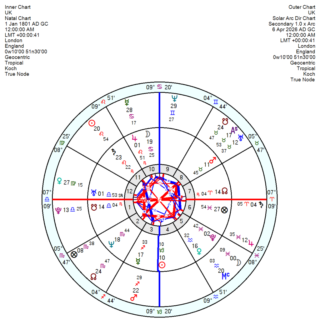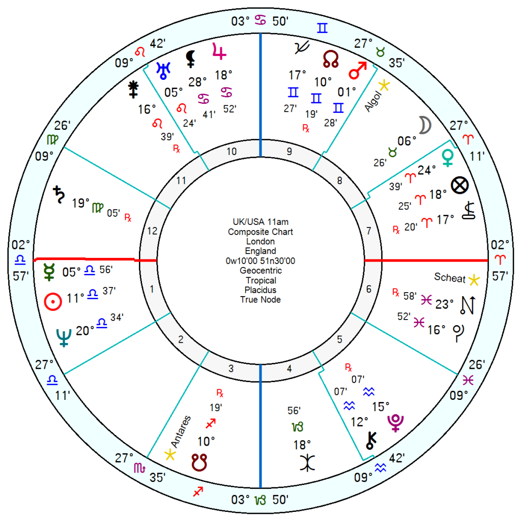 At that point tr Uranus will also square the UK Pluto at 2 degrees Pisces so there will be a collapse of the older order and start of building anew. Interestingly the UK/USA chart relationship chart has tr Pluto opposition the composite Uranus exactly now till late this June and again on and off till late 2027 – which hints at the same kind of upheaval but in reverse. As one goes down (no doubt temporarily until post-Trump) another comes together.