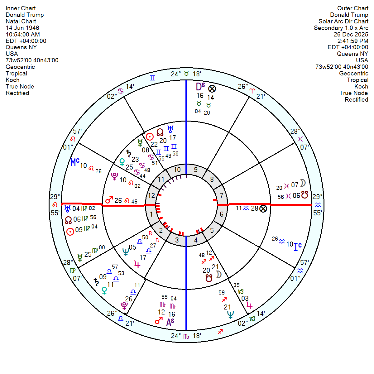 Donald Trump, 14 June 1946 10.54 am New York, continues (at present) to defy gravity. But with Pluto now into his 6th house of health and work for a long haul ahead and tr Saturn Neptune into his financial and psychological 8th something will have to give at some point. His Solar Arc Neptune is still conjunct his Moon and moves to oppose his Sun throughout 2026 – which for normal human beings is lacklustre, vague, discontented and indecisive. His Solar Arc Midheaven will be conjunct his 12th house Pluto for another six months which will rev up his control-freakery and could bring dark secrets into the open. Tr Uranus will square his Ascendant in April 2026, perhaps shining light on his image and shaking up his persona. The February Solar Eclipse in Aquarius will conjunct his Descendant and oppose his Mars – for major relationship blow-outs.