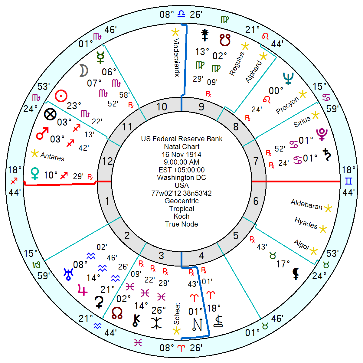 [Add On: Not sure how I missed it – but the Solar Arc Pluto is square the US Jupiter now and through 2026 – which is a might-makes-right and rules-don’t-apply-to-us kind of aspect. And so it transpired.]The US Federal Reserve Bank, 16 November 1914 9am Washington, DC, has tr Neptune square the Saturn Pluto throughout 2026 into early 2027 which will erode even its steely nerve with panics, uncertainty and confusion. Plus a sudden-surprises-bringing-insecurity and rash decisions with tr Uranus opposition the Mars in Sagittarius from mid June 2026 into April 2027. There will be heightened arguments through 2027 with tr Pluto square the Mercury and turbulence in 2028 with tr Pluto conjunct the Uranus.