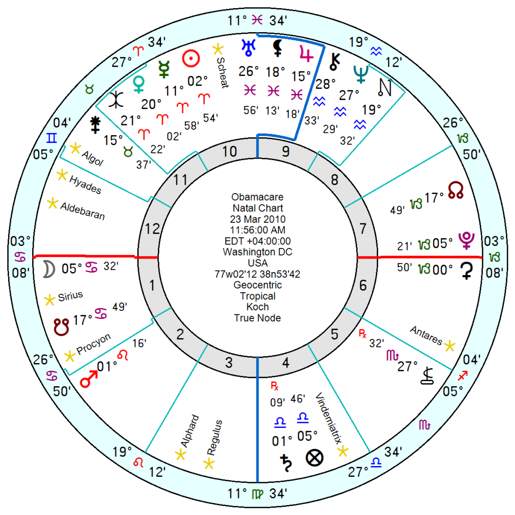 Obamacare, 23 March 2010 11.56am Washington, with a Cardinal Grand Cross in early degrees will suffer under tr Saturn in hard aspect to its Saturn opposition Aries Sun square Pluto opposition Moon in the early months of 2026; with tr Neptune following suit through a disappointing and dissolving 2026/27.
