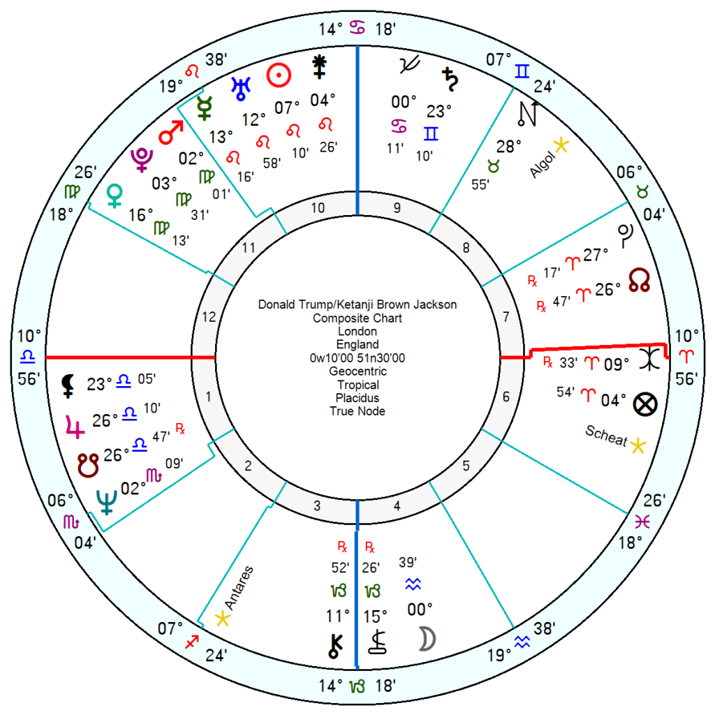 His relationship with virtually all the justices will be stressed ahead apart from Samuel Alito and Brett Kavanaugh. Even Amy Barrett is having a meltdown with him, as well as the other liberal or more moderate justices like Neil Gorsuch, Sonia Sotomayor, Elena Kagan and especially Ketanji Brown Jackson. Ketanji has a bitter-dislike composite Mars conjunct Pluto in her relationship chart with DT which is being triggered by tr Uranus in June and across the New Year.