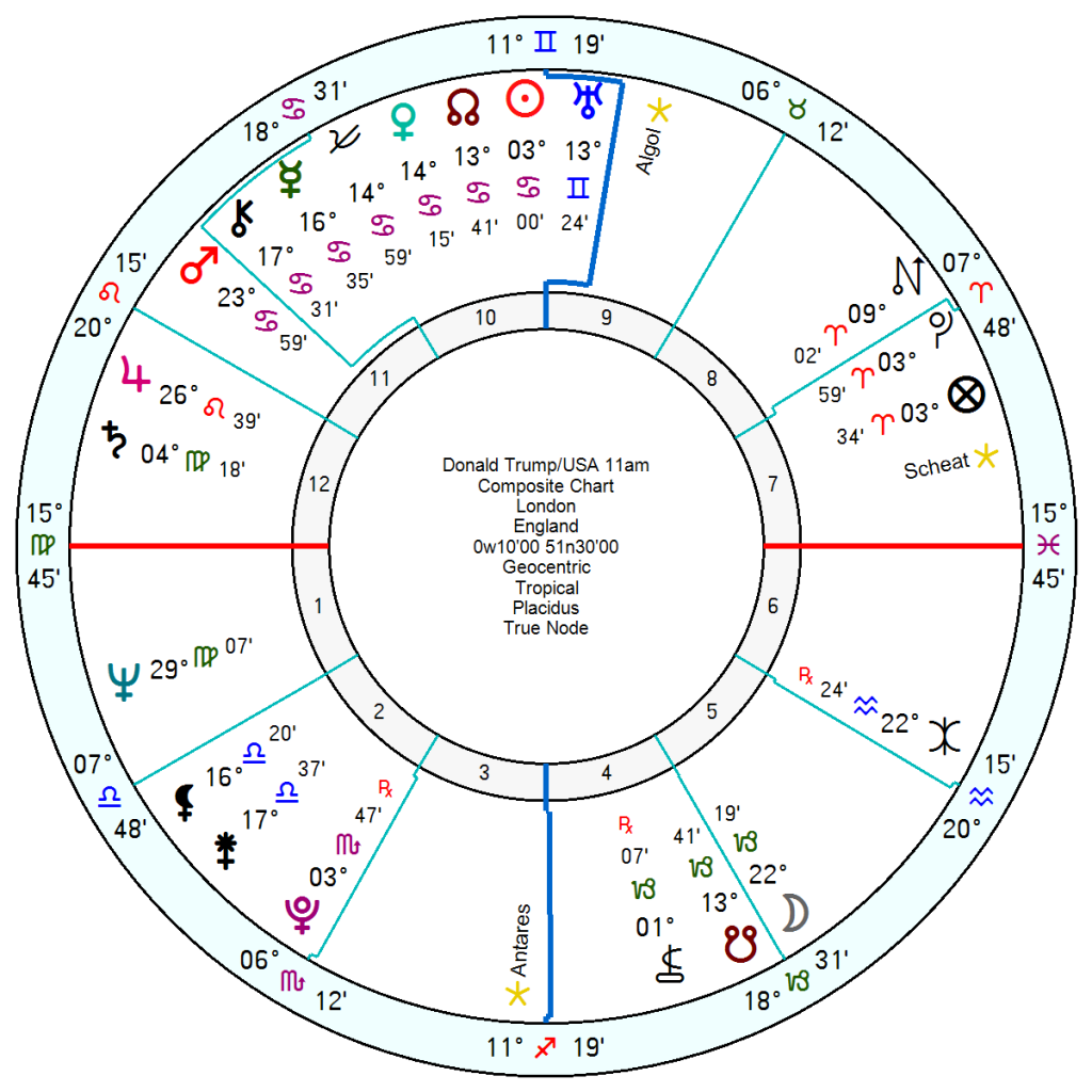 Trump’s relationship with the USA in essence is chained together with a composite Sun trine Pluto sextile Saturn – but even that is beginning to come unstuck this year with a disappointing, undermining tr Neptune square the composite Sun starting late this April to late May, dissolving the ties that bind; with serious tensions erupting from this July onwards as tr Uranus is square the composite Saturn, followed by a pressure-for-change tr Pluto square the Pluto to the year’s end. Tr Uranus will continue to ratchet up tensions till May 2027 and tr Neptune will continue to sink the ground under his feet till early 2028. He won’t let go easily but whether through unpopularity or ill-health or both, he will find his grip on the nation loosening fast. Tr Saturn squared the composite Sun recently in mid March two weeks after the Iran attack when it became clear this was no speedy in-and-out venture.