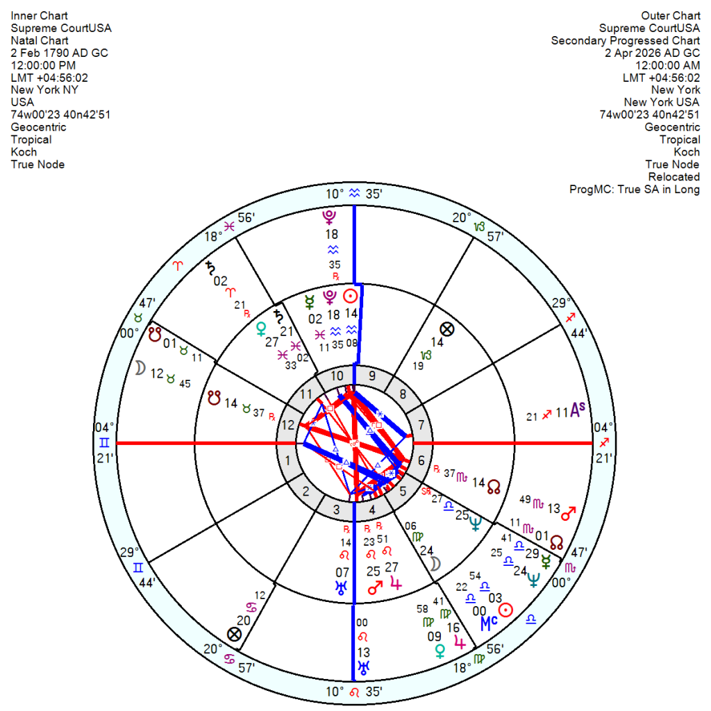 The Supreme Court, 2 February 1790 New York, has a Sun Pluto conjunct in Aquarius which seems fitting for the new era. But it will be facing a monumental battle ahead with the Progressed Mars square the Sun in 2027 as well as being conjunct the Scorpio North Node. So it may come to a considerable standoff and collision, almost existential, so it will test their resilience as tr Pluto opposes the Uranus in 2027/28 as well threatening to upset the applecart.