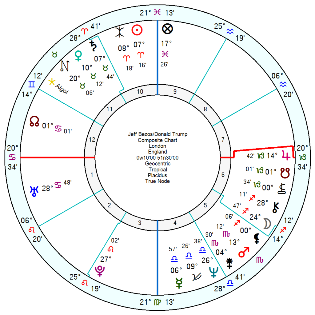 Bezos’ relationship with Trump is moving into a new unsettled phase at the moment with tr Uranus square their composite Pluto with the Aquarius solar eclipse in opposition to the Pluto as well – a test of alpha’s power battle? Where it runs into real trouble is by 2027 with tr Neptune conjunct the composite Sun and opposition Mercury and tr Pluto square the composite Saturn.