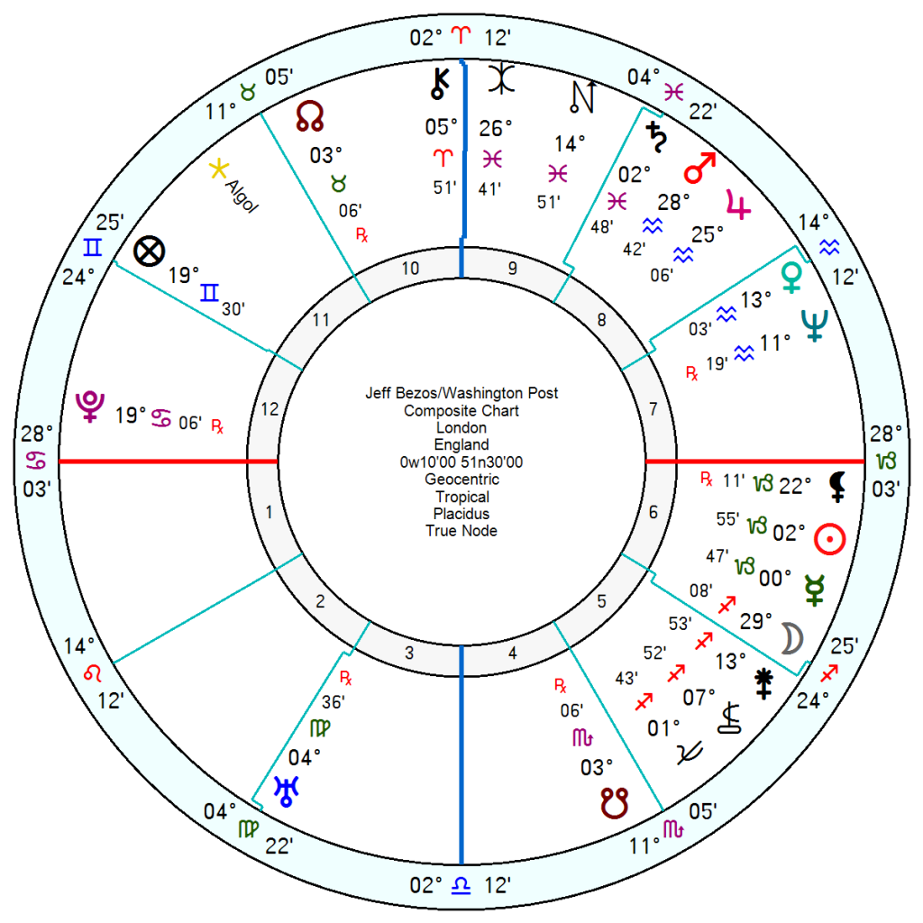 Bezos was never a good fit with the WP with his Saturn Venus conjunct the Aquarius North Node and his Neptune square hinting at uncertainty and distrust; with his Pluto (Uranus) in a road-blocked opposition to the WP Saturn.