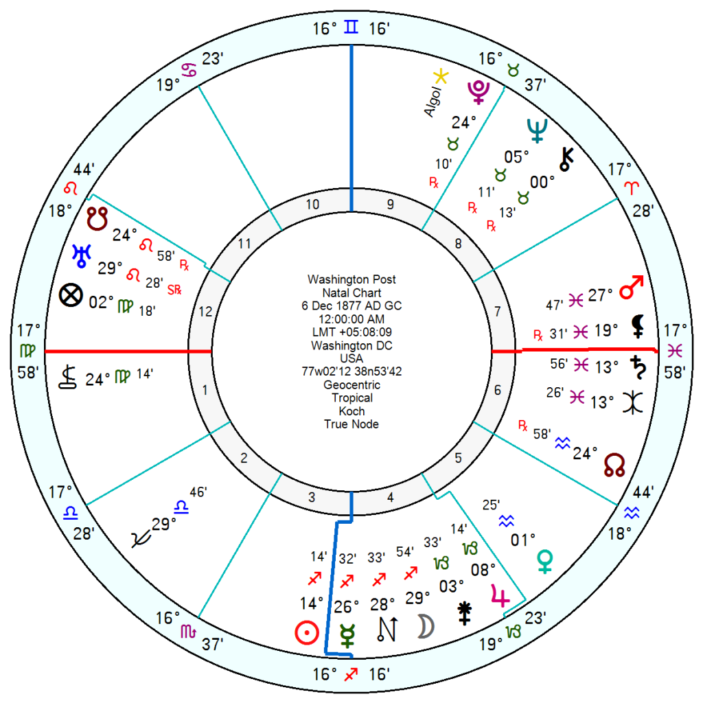 The Washington Post, 6 December 1877, with a Sagittarius Sun, Mercury and maybe Moon, has a potential for widescale communication, an interest in the global world, how society works and culture. Mercury square Mars and trine Uranus will give added punch to its views; Uranus square Pluto an inclination to upset the status quo and push forward with reforms.